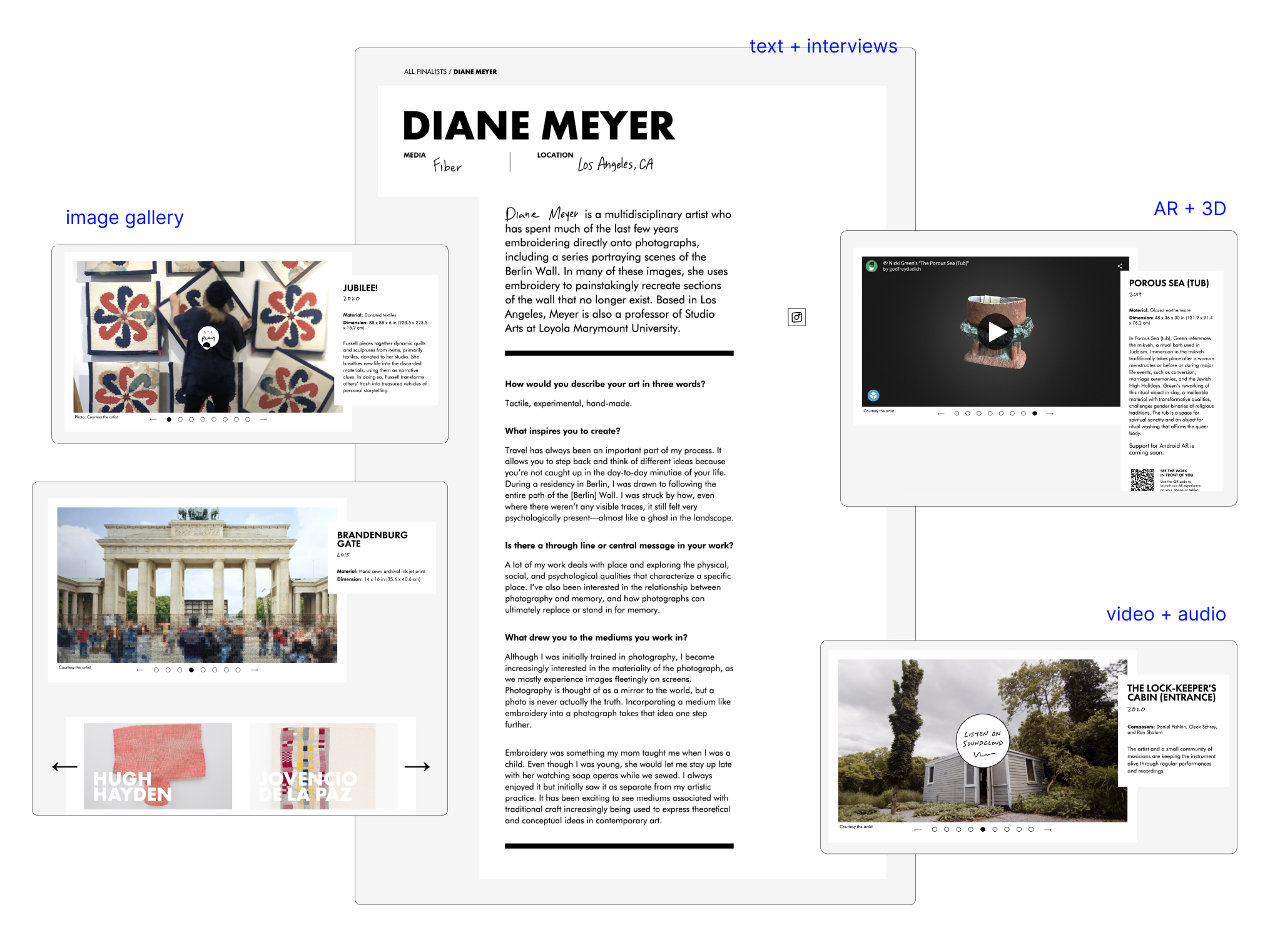 As the studio's first product designer, I co-created directly with the Design Director to craft a digital exhibition for the Burke Prize 2021, with the aim to focus on accessibility and showcase artists' work in digital narrative form. ☞ Launched in 2022 and won Museum Association of NY's 2022 Awards of Merit for Excellence in Design and shortlisted for Best Digital Product Innovation for the Digiday Media Awards