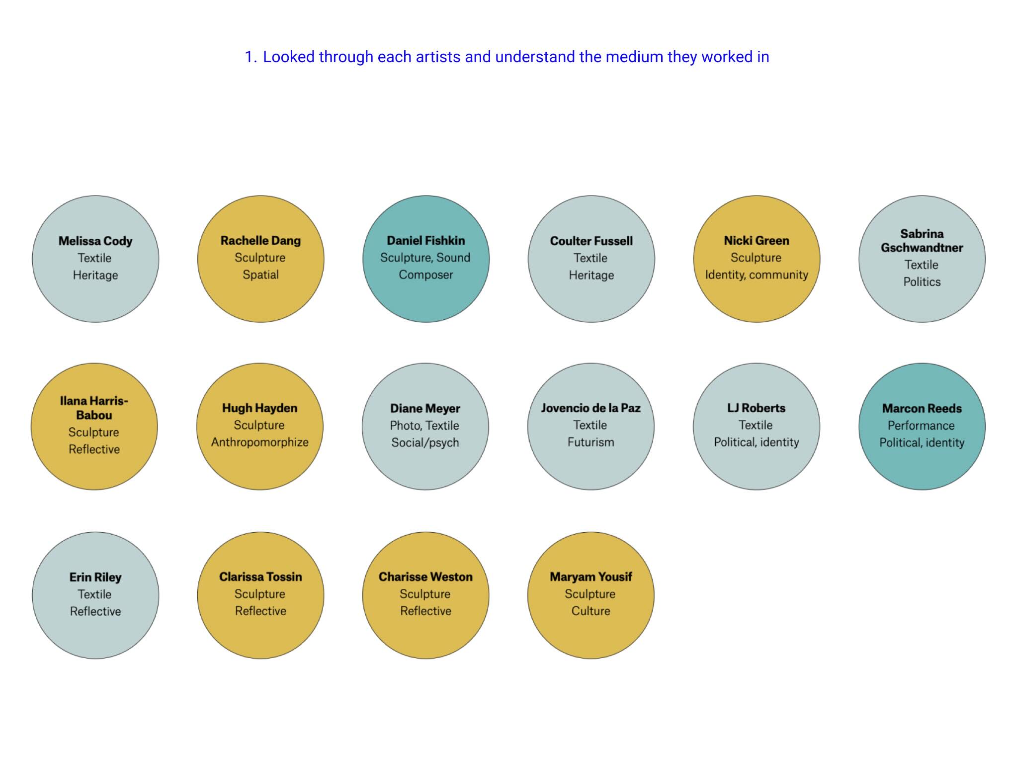 Took stock of all 14 artists who have unique mediums and statements for who they are (note: sculpture is a very physical medium)